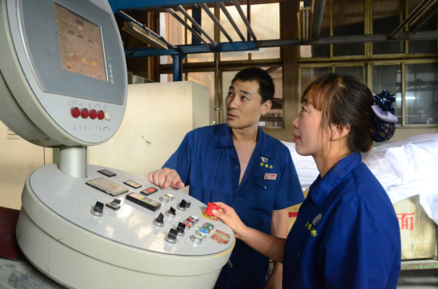 圖為面一車間拉幅預(yù)縮精益生產(chǎn)承包小組副組長孫新強(qiáng)(左)、預(yù)縮機(jī)機(jī)長郭芳,在預(yù)縮機(jī)操作臺(tái)前準(zhǔn)備開車生產(chǎn)的情形。