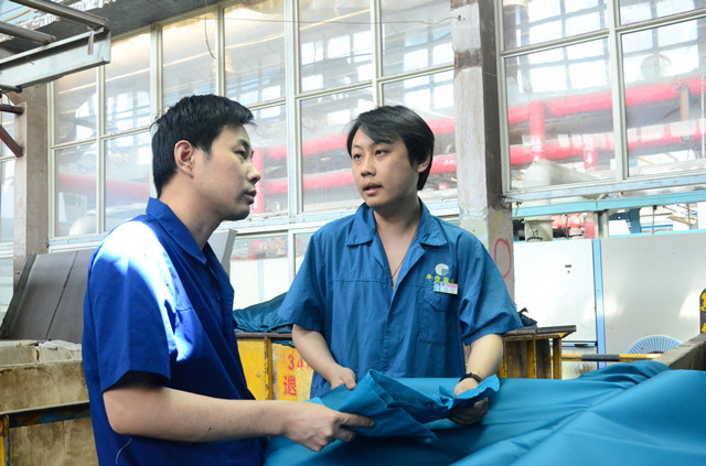 圖為公司家紡車間的趙山松(右)和韓延衛(wèi)(左)在對比優(yōu)化工藝后的下機產品。