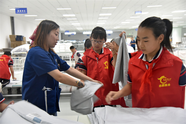 9月23日,濱城區玉龍湖小學四年級學生在老師帶領下走進公司,實地參觀了公司的生產車間以及部分展廳,現場體驗了家紡產品驗整及包裝等生產環節,感受勞動的艱辛與快樂。