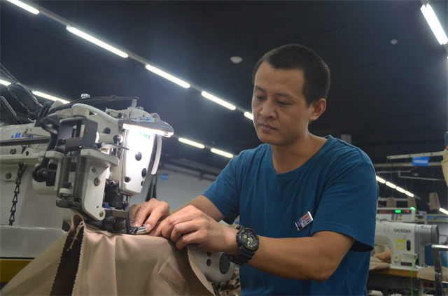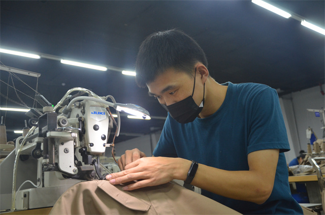 服裝車間縫制二班多能工郭叢叢進(jìn)入公司10年來(lái),靠著不斷追求精進(jìn),成長(zhǎng)為對(duì)服裝生產(chǎn)各環(huán)節(jié)駕輕就熟的“老把式”。