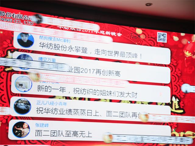 今年華紡“春晚”與往年不同的一個亮點在于,在演出現場加入了“微信彈幕”,現場通過微信關注的觀眾中,有26名觀眾在三次自動搖獎成為幸運觀眾而獲得了獎勵。演出結束后,公司總經理閆英山等公司領導,與參加演出的員工合影留念。