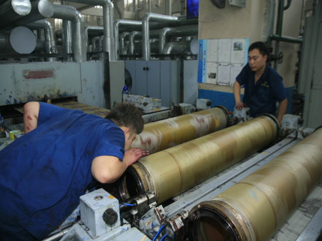 花一車間后處理技術員張延軍(圖右)與軋光機機長吳秀祝在交流生產情況。他倆表示,每一米優質產品都是靠專注認真干出來的。