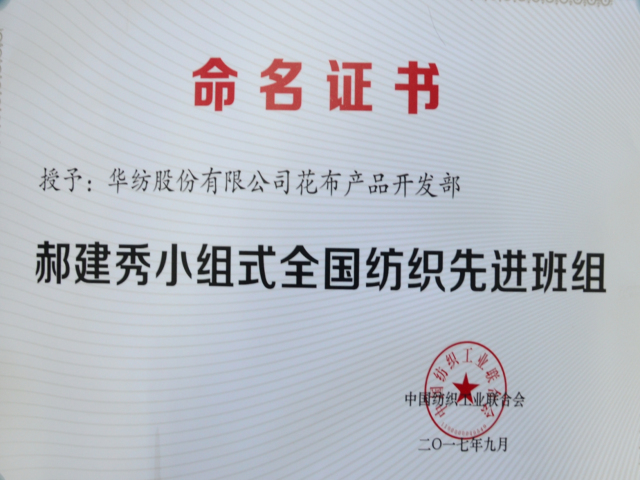 導(dǎo)讀:公司花布產(chǎn)品設(shè)計開發(fā)部榮獲郝建秀小組式全國紡織先進班組。