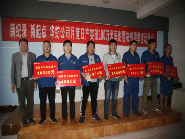 10月11日,公司召開主題為“新紀錄,新起點,華紡公司月度日產突破100萬米表彰暨決戰四季度動員會”,會上對在9月份印染生產計劃完成工作中成績優異的55個機組和41位個人進行了表彰獎勵,對第四季度工作進行了部署。